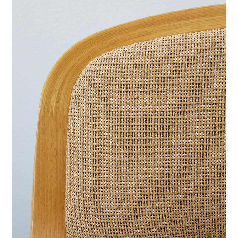 ジャパニーズモダンの礎を支えたデザイナー剣持勇が創設し、多くの公共建築やプロダクトの設計を手掛けてきた剣持デザイン研究所によってデザインされました。 厚みのある張地にゆったりとした座り心地が特徴のダイニングチェアです。 大きくラウンドを描いた背もたれから、流れるようにアームに繋がるフレーム。成形合板の技術「コマ入れ」を用いて作られています。パーツの接続をすっきりと見せるだけでなく、より強固にする天童木工の得意技術のひとつです。 他のダイニングチェアと比べ、座面はやや低めに作られています。リビングダイニングのイスとしてもおすすめです。お食事の後にはそのままくつろぎのイスとしてもお使いいただけます。